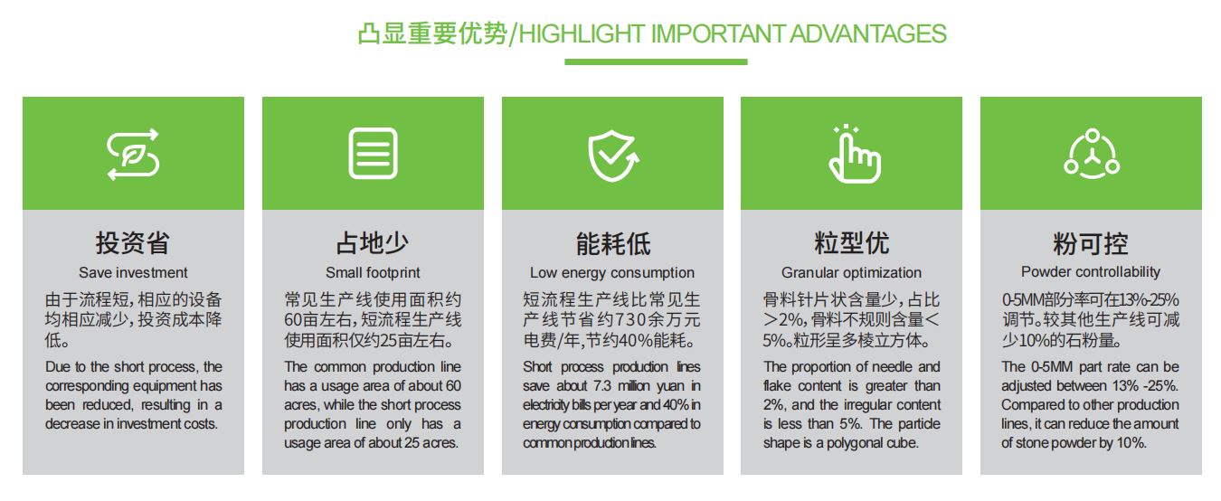 該項目全面建設打造全流程自動化、智能化、數字化生產運營管理系統, 投產運營后資源消耗低、粉塵排放低、環境效益好,達成綠色、環保、節能、 高效的目標,滿足目前“低耗能、高產能、粒型優”的市場需求。給客戶節約 了投資成本、土建成本、運營成本、管理成本、場地成本等費用。