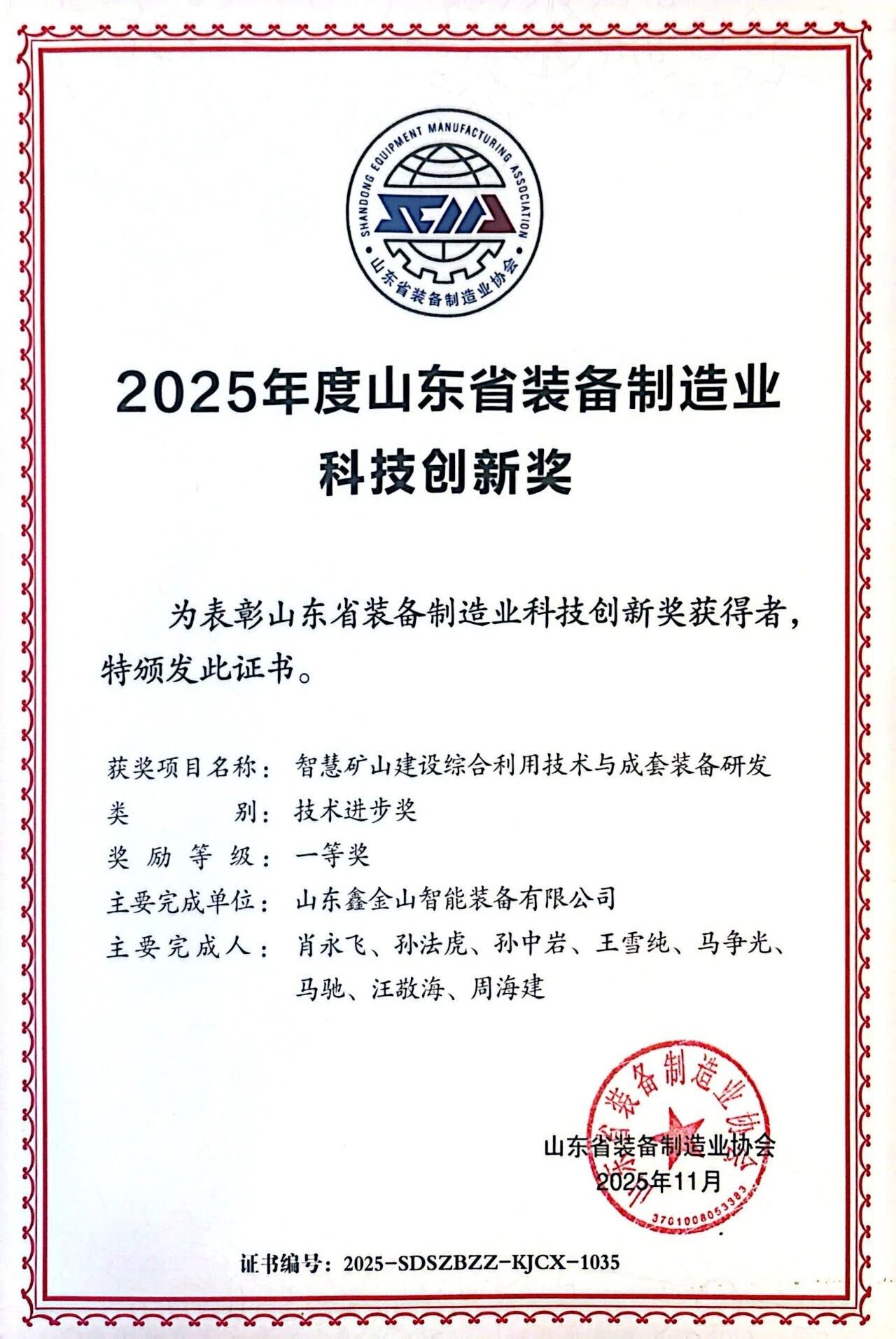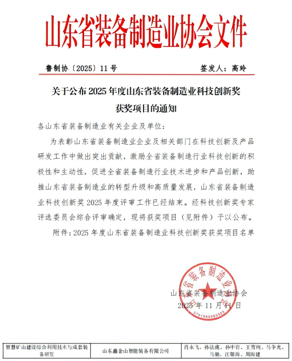 山東省裝備制造業科技創新獎是全省裝備制造行業科技創新的最高榮譽之一,旨在表彰在技術研發、產品創新中作出突出貢獻的企業與項目,助力全省裝備制造業轉型升級與高質量發展。本次評選經專家評審委員會嚴苛審核,從數百個申報項目中擇優遴選,鑫金山憑借扎實的技術積累、突破性的創新成果,成功躋身一等獎榜單,彰顯了公司在礦山裝備領域的硬核實力。