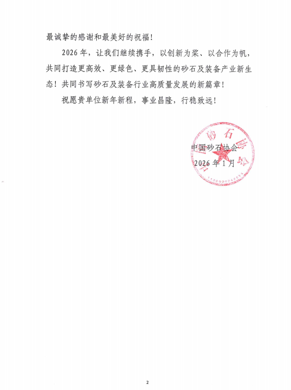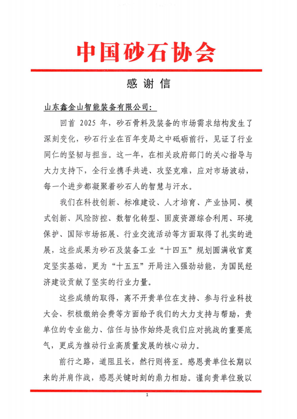 導(dǎo)讀:感謝信 近日,山東鑫金山智能裝備有限公司收到中國砂石協(xié)會發(fā)來的感謝信。鑫金山對此致以誠摯謝意,這份認(rèn)可既是對企業(yè)深耕行業(yè)的肯定,也是對全體員工的莫大鼓舞。 多年來鑫