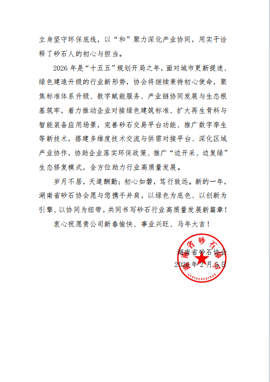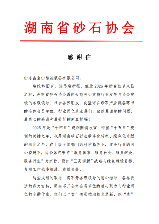 瑞蛇辭舊歲,駿馬啟新程。2026 年新春佳節(jié)來(lái)臨之際,山東鑫金山智能裝備有限公司收到湖南省砂石協(xié)會(huì)發(fā)來(lái)的感謝信,字里行間的認(rèn)可與期許,讓我們倍感溫暖與鼓舞。