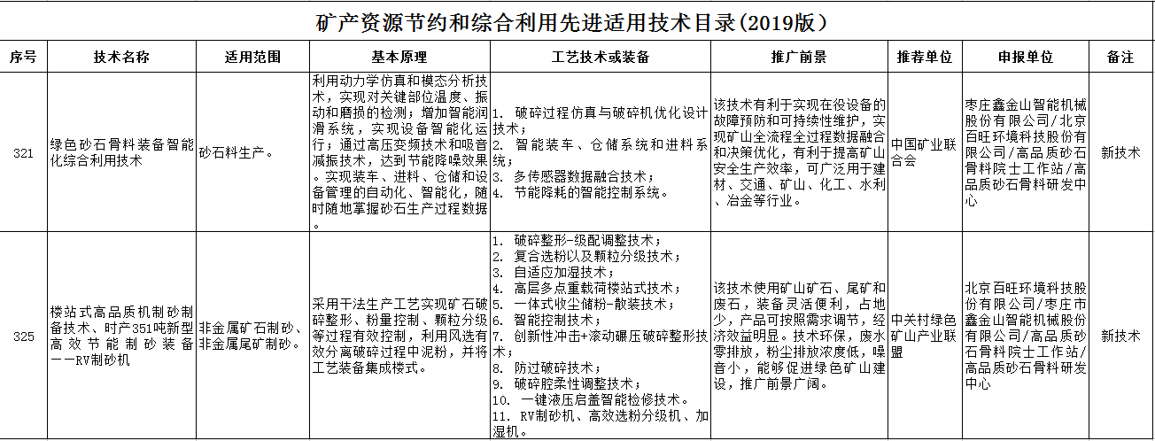 導(dǎo)讀:2019年12月,國家自然資源部辦公廳發(fā)布了關(guān)于《礦產(chǎn)資源節(jié)約和綜合利用先進(jìn)適用技術(shù)目錄(2019版)》的公示,棗莊鑫金山智能機(jī)械股份有限公司的樓站式高品質(zhì)機(jī)制砂制備技術(shù)、時(shí)產(chǎn)351噸新型高效節(jié)能制砂裝備——RV制砂機(jī)和綠色砂石骨料裝備智能化綜合利用技術(shù)作為新技術(shù)成功入選,這兩項(xiàng)先進(jìn)適用技術(shù)分別由中關(guān)村綠色礦山產(chǎn)業(yè)聯(lián)盟和中國礦業(yè)聯(lián)合會(huì)推薦。