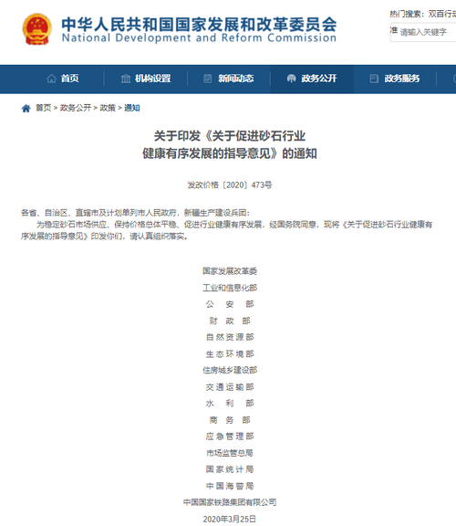 導讀:為穩(wěn)定砂石市場供應、保持價格總體平穩(wěn)、促進行業(yè)健康有序發(fā)展,經國務院同意,2020年3月25日,國家發(fā)改委等十五部門和單位聯合印發(fā)了《關于促進砂石行業(yè)健康有序發(fā)展的指導意見》。