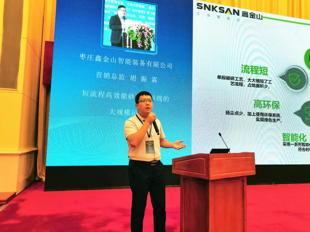 在大會主題報告上,棗莊鑫金山營銷總監(jiān)胡振霖作了題為《短流程高效能砂石骨料線的大規(guī)模應(yīng)用》的精彩報告演講。報告中,系統(tǒng)介紹了鑫金山獨(dú)特的短流程高效能砂石骨料生產(chǎn)線在行業(yè)中的大規(guī)模應(yīng)用。并以綠色礦山中綠色骨料線的“節(jié)能、環(huán)保、智能、集約”四大方面為核心,根據(jù)鑫金山時產(chǎn)600t—3000t的骨料線具體案例,詳細(xì)展示如何用EPC的方式建設(shè)一條符合綠色礦山要求的短流程高效能砂石骨料生產(chǎn)線。吸引了眾多與會嘉賓的高度關(guān)注。