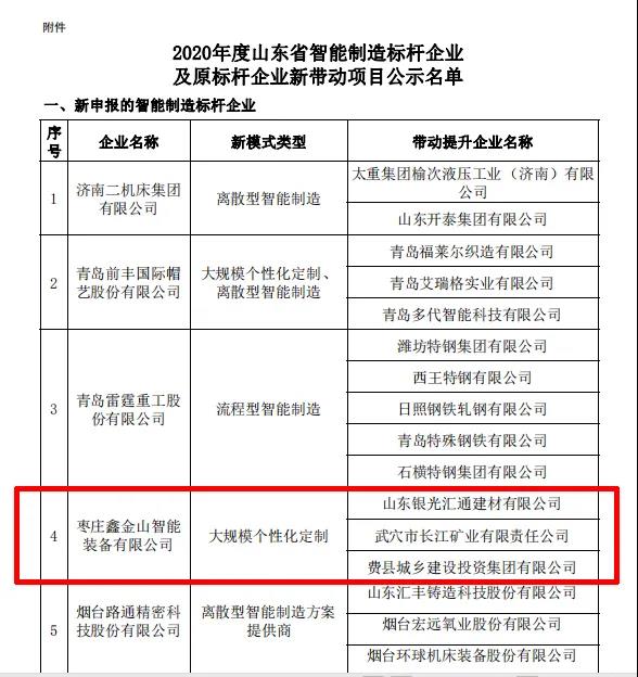 近日,省工業(yè)和信息化廳對獲評2020年度山東省智能制造標(biāo)桿企業(yè)及原標(biāo)桿企業(yè)新帶動項目名單進行了公示,棗莊鑫金山智能裝備有限公司成功入選,成為了2020年度山東省首批智能制造標(biāo)桿企業(yè)之一。