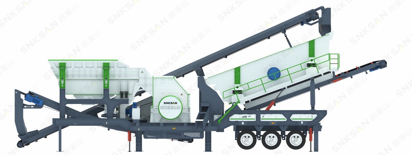 移動站整機配置給料機、錘破、振動篩和皮帶輸送機,集破碎、篩分、給料和物料輸送于一體,高度集成,是一個移動的小型生產線。